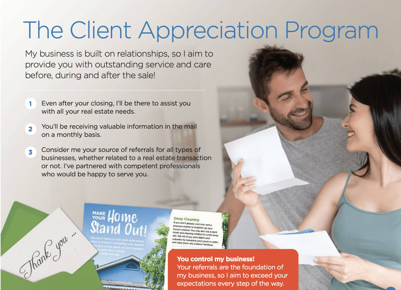 There is a special recipe for real estate professionals called the Three C's to Success - Contact, Care, and Community. I use this principle to create trust with my clients and help them achieve their real estate goals. Even after your closing, I'll be there to assist you in any way that I can!